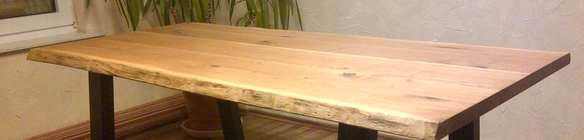Tisch aus Eiche mit Baumkante und pulverbeschichteten Fußgestell.